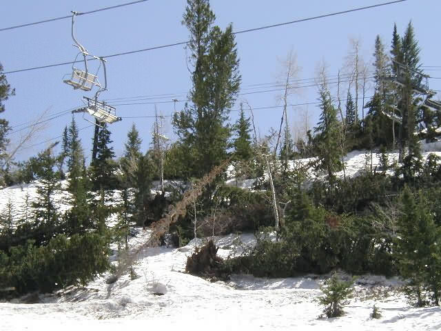 Wind damage between Mid-Gad and Gadzoom chairs, May 2001, Gad Valley, Snowbird, UtahIt's not all bad---when these trees are cleared, new terrain will be available to ski....